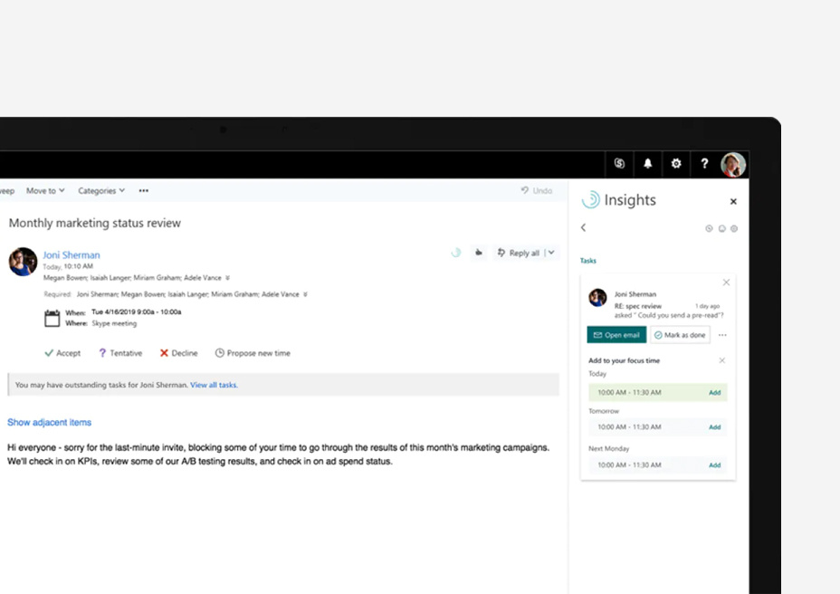 - Inline suggestions in Outlook: Contextual, data driven recommendations to improve your work patterns.