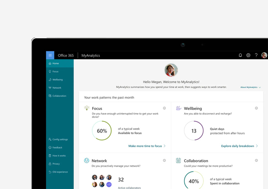 - MyAnalytics dashboard: See how you spent your time over the past month, productivity insights about your work patterns, helpful suggestions for improvement, and information about your network, top collaborators, and collaboration activities.