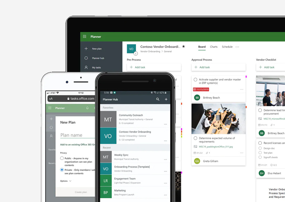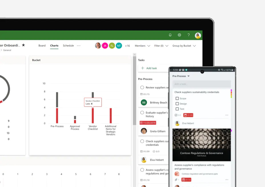 Streamline intake and management of your teams' tasks with Microsoft Planner. Planner makes it easy for you to create, assign, and track tasks and work items to completion. A visual layout makes it easy to know who's working on what and quickly understand the status of items to ensure everyone is on the same page.